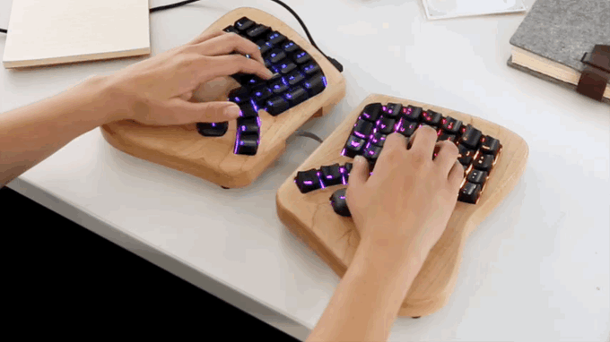 ☝人家的鍵盤是一個整體,而這款鍵盤是分為兩個部分。這個真的是完全按照人體工學的原理進行設計的,每個按鍵的分布也不是同于傳統鍵盤,完全是按照我們日常打字時候手指和手肘所在的位置和角度。但唯一不方便的是它需要兩個手分開操作,適應起來也并不簡單。